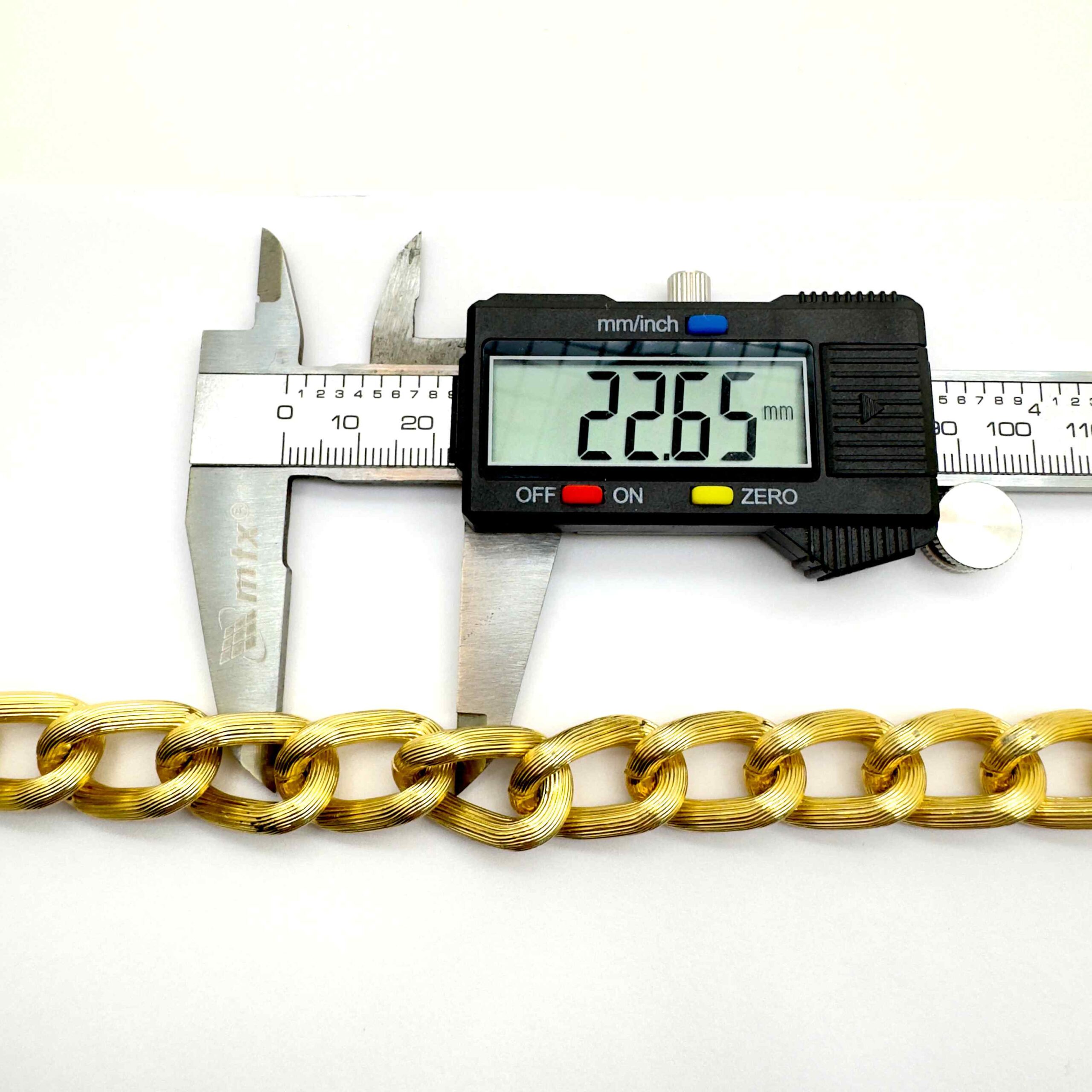Com arame de 4.0mm de espessura, essa corrente é robusta e resistente, sendo amplamente utilizada na confecção de alças de bolsas, cintos, calçados, colares, pulseiras e peças artesanais. Seu acabamento frisado realça o brilho do metal, proporcionando um visual marcante e elegante.